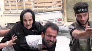 Hier ein nettes Propagandafoto vom edlen Rebellen, der den Flüchtenden den Weg weist und Oma angeblich aus Aleppo bringt...