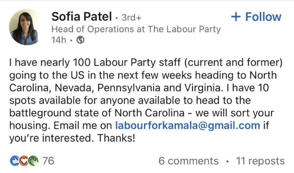 Die Sozialisten England bezahlen 100 Parteimitglieder, um in den USA kräftig Werbung zu machen für die Demokraten und Kamala Harris.