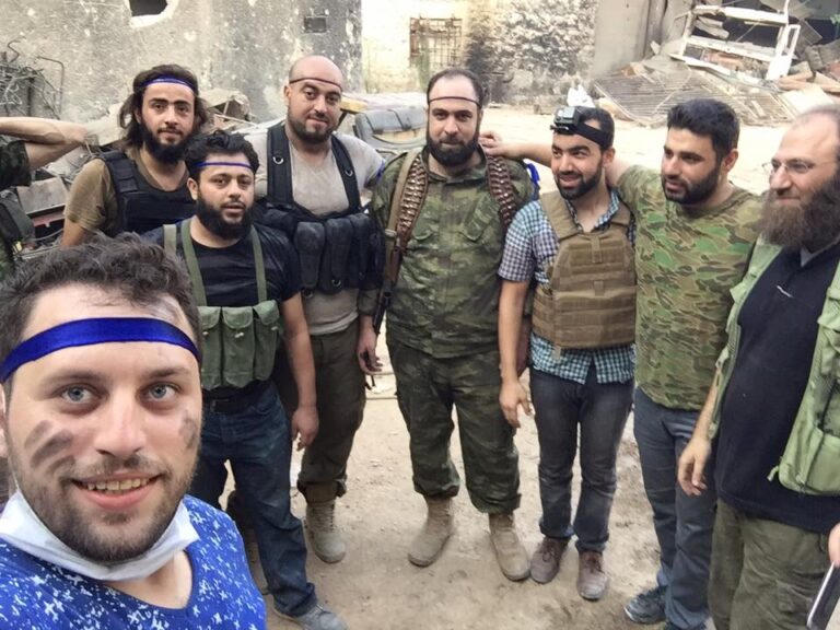Der Fotograf ist Fadi al Halabi, welcher von Volker Schwenck (ARD) als Aktivist und wertvolle Informationsquelle eingeschätzt wird. [22] Wie Ruslan so ist auch Halabi ein Begleiter von Terroristen. Die „moderaten Oppositionellen“ von al-Zenki verschossen auch immer wieder gern selbst gefertigte Chloringas-Granaten aus Ost-Aleppo. [23][24][25] Unter anderem in jener Zeit, in der sich Ruslan mit al-Zenki’s ablichtete. [26] Das zur Herstellung benötigte Chlor ist in ausreichender Menge im zentralen Wasserwerk der Stadt Aleppo gelagert – und dieses Wasserwerk lag (bis November 2016) im Herrschaftsbereich der Terroristen in Ost-Aleppo.
