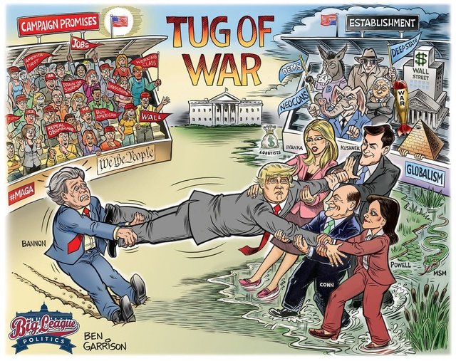 Ja genau, von Ben Garrison gibt es auch eine Karikatur, wo auf der einen Seite das Volk und auf der anderen Seite der Deep State an Trump zerrt. Auf der Seite des Deep State sind Ivanka und Jared.
