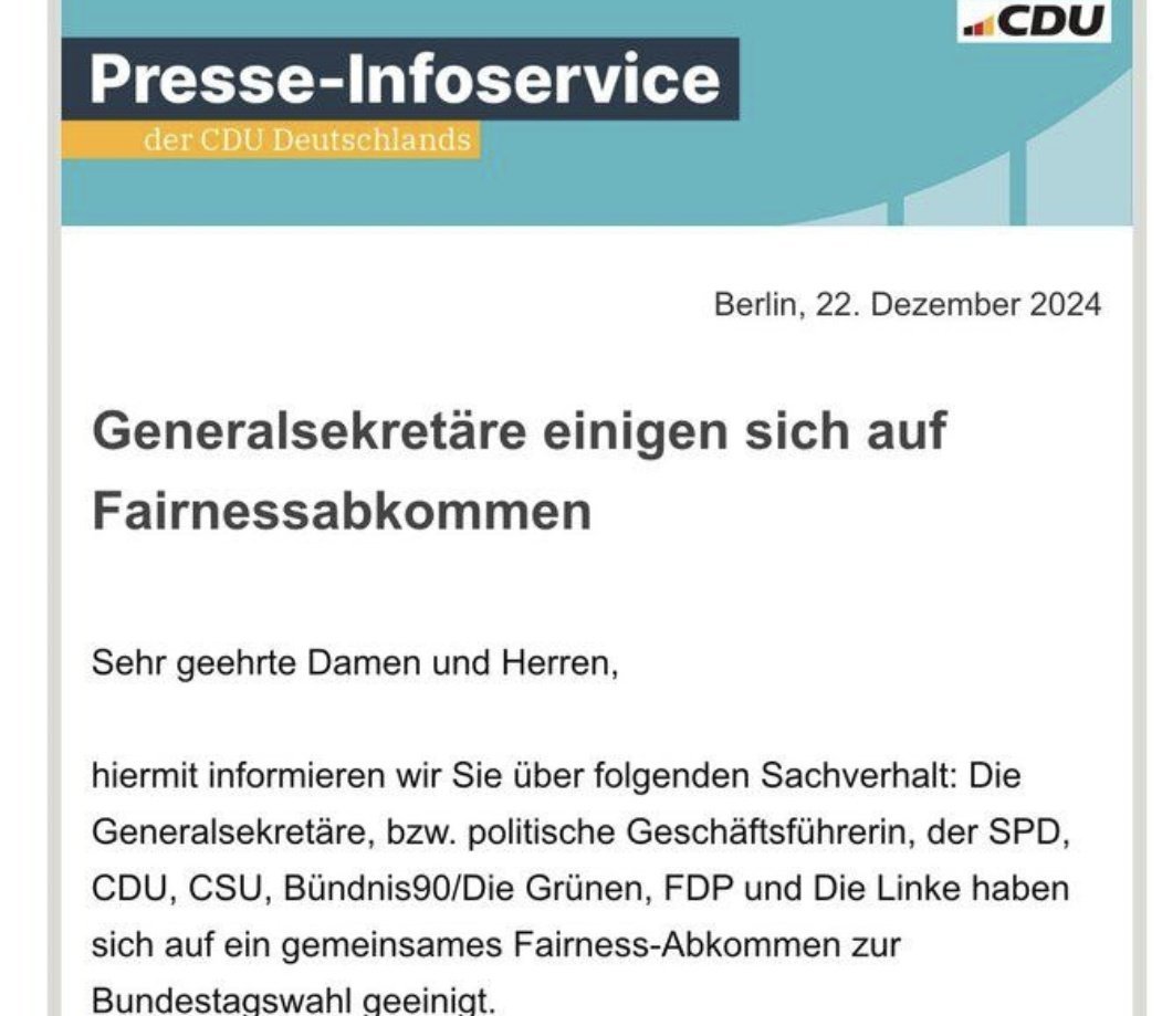 hiermit informieren wir Euch über folgenden Sachverhalt: Die SED hat sich mit ihren Blockparteien SPD, CDU, Grüne und FDP auf ein gemeinsames Fairness-Abkommen zur Wahl des Bundes-Sowjets geeinigt.