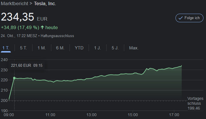 Tesla hat heute an nur einem einzigen Tag um 125 Milliarden US-Dollar an Wert zugelegt, was mehr als dem Doppelten des gesamten Börsenwerts von VW entspricht.
