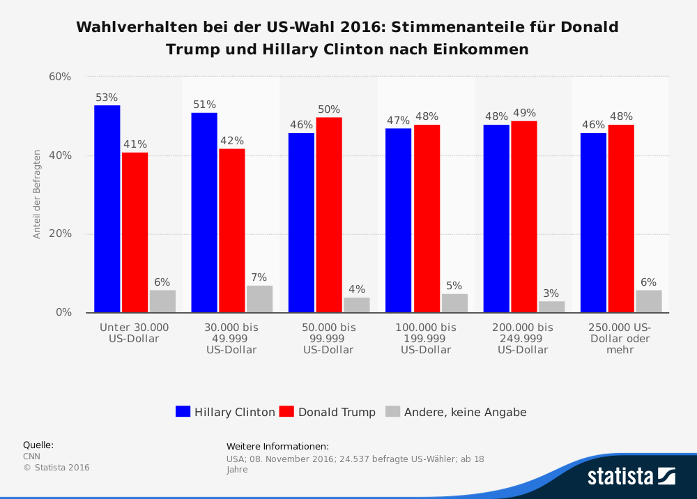 Dass Trump bei den besser verdienenden gut abschneidet ist ja auch nicht verwunderlich. Er verspricht ihnen ja massive Steuererleichterungen.