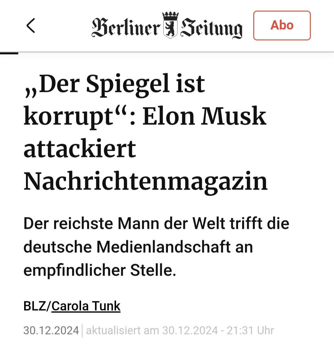 Ich halte die Aussagen von Musk für keine zufällige Meinungsäußerung sondern für ein mit Trump abgesprochenes Gegengewicht zur umfassenden medialen Meinungsmanipulation der US - Globalisten in Deutschland.
