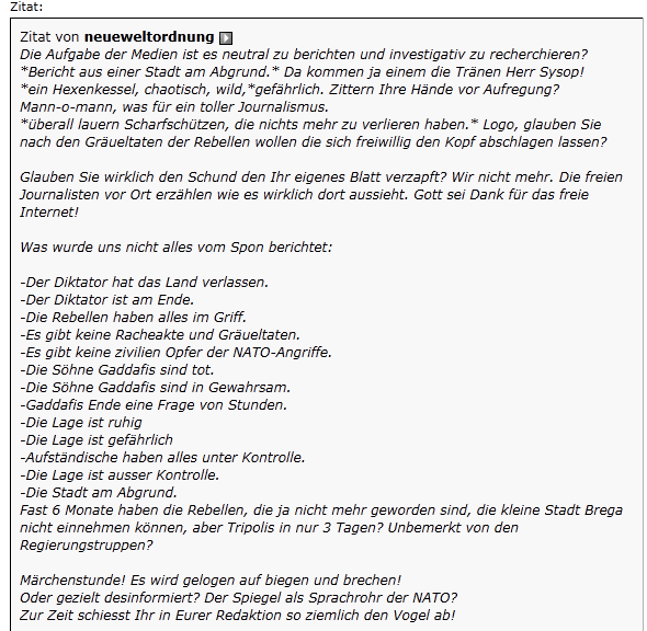 Ich frage mich ernsthaft, wie einige immer wieder eine Prognose zu stellen wagen, obwohl man nicht einmal mit Sicherheit weiß, ob das Staatsgebilde Libyen überhaupt so wie wir es kennen erhalten bleibt. Gaddafi hat Waffen an palästinensische Terroristen geliefert und hat sich auch später dazu entschlossen, sich dagegen zu entschließen, um sich dem Westen anzubiedern.